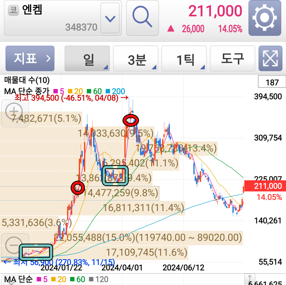 23년 12월 초 6만원대 첫 매수(포트 10%) 이후, 계속 매수해서, 12월 마지막날 7만 원 후반대에서 집중매수, 포트의 60%를 엔켐으로 채우는 초강수를 두었다. 한 종목에 집중투자하면 좋지 않은 점이 이런 급등 시나 급락 시에 물량을 지키는 것이 멘탈적으로 거의 불가능하다. 빨간색 동그라미 친 2월 초순이었나 20만 원을 넘을까 말까 하는 그 순간에 전부 매도하였다. 물론, 그전에 14만 원에서 10만 원으로 급전직하 출렁이던 1주일간 부분매도 매수를 통해서 물량을 가까스로 지킨 후에, 다시 두 배 가까이 왔고, 나의 매수 평균가 대비 2.5배나 올라왔기에 매도해도 되겠다 싶었지만, 주가는 천정부지로 치솟아 35만 원을 찍었다. 그 후, 급락하여 20만 원 초반대를 전전할 때, 다시 포트 50%를 엔켐에 실었다. 재차 올라가면서 전고점 35만 원 내외가 가까워져도 투심이 센 걸 확인하고는 더 가겠다는 확신이 들었고, 36~39만 원 사이에서 분할매도, 전량매도했다. 엔켐 한 종목으로, 내 자산은 3배 가까이 불었다. 단 3개월 만에^^ 아래 차트에는 표시 안 했지만, 최근 코스닥이 -11% 급락하던 날, 종가로 엔켐을 15만 원대에 잡았다. 단기에 벌써 35%를 벌었다. 물론, 비중은 9% 정도로 크게 담지는 않았지만, 내게는 정말 고마운 종목이다.