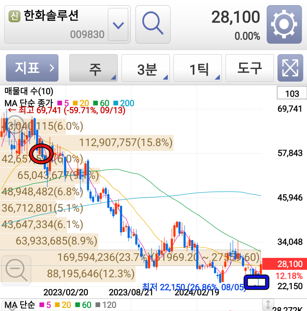 아래 한화솔루션 주봉차트이다. 22년 중순부터 매도매수를 간간히 하면서 괜찮은 수익을 올리다, 23년 1월, 회사분할에 따른 1개월 거래정지가 싫어서 5만 원대에서 매도했다. 그 후, 최근 2.2만 원까지 하락하였다. 나는 최근 22700원에 내 포트 7% 정도를 할애해서 담았다. 조금 더 담았어야 하나 후회도 되지만, 다음 주에 조정준 다면 조금 더 담을 생각이다.