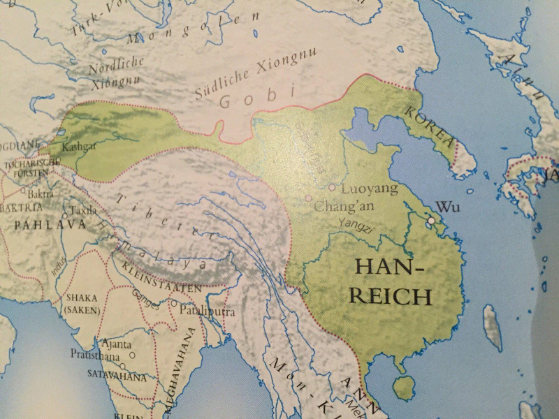 초록색으로 칠한 부분이 기원전 2~1세기 중국 통일왕조인 한나라의 영토를 표현하고 있습니다.